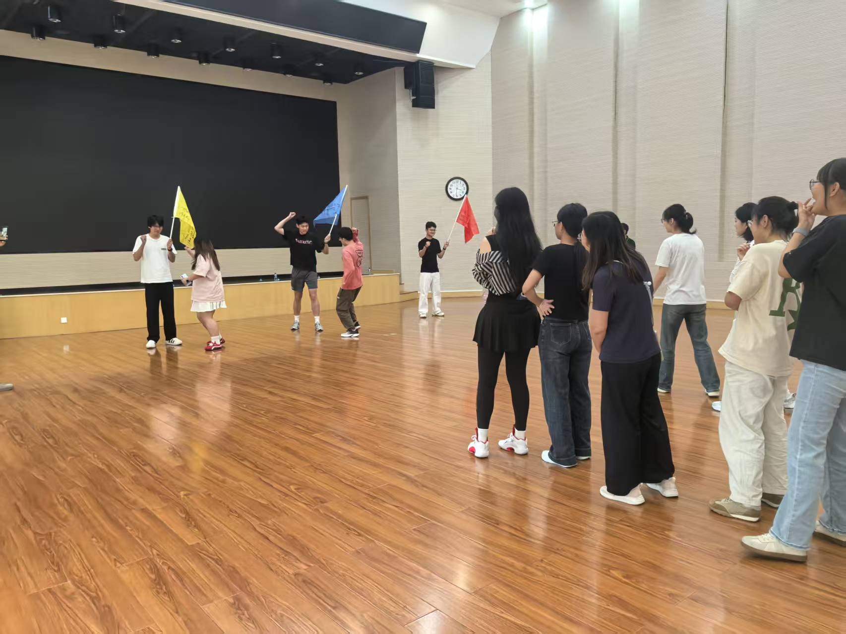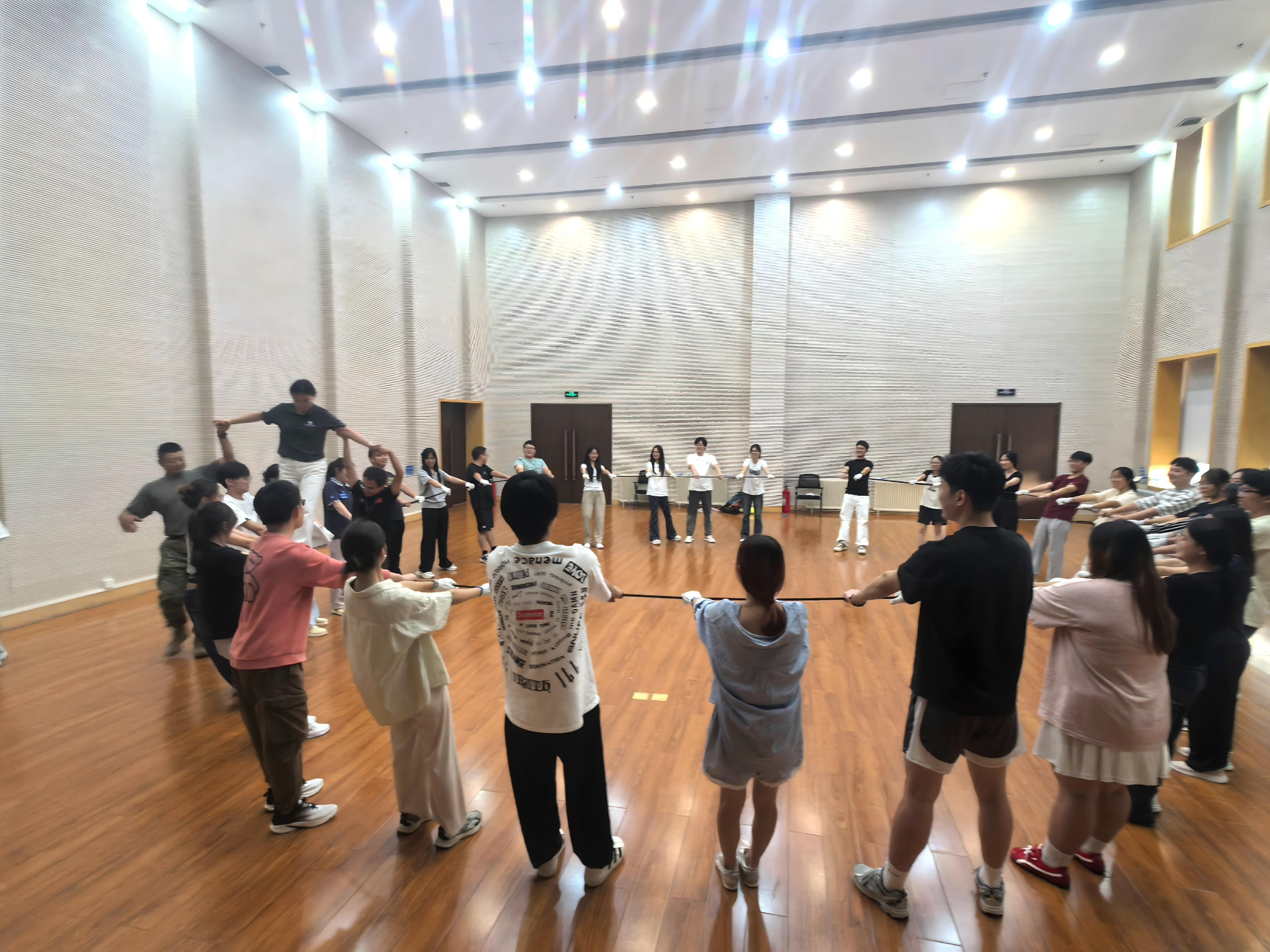 活动在轻松融洽的氛围中拉开帷幕,一系列精心设计的团队协作项目迅速拉近了新生之间的距离。“姓名叠罗汉”环节既锻炼了记忆力与专注力,也帮助大家在欢笑中快速相识;“龙翻身”项目考验团队配合与信任,队员们在默契协作中顺利完成挑战;“斗转星移”通过集体抛接动作,提升了全队的节奏感与协调能力;最后的“激情节拍”将现场气氛推向高潮,铿锵有力的口号展现出同学们的蓬勃朝气与自信风采。