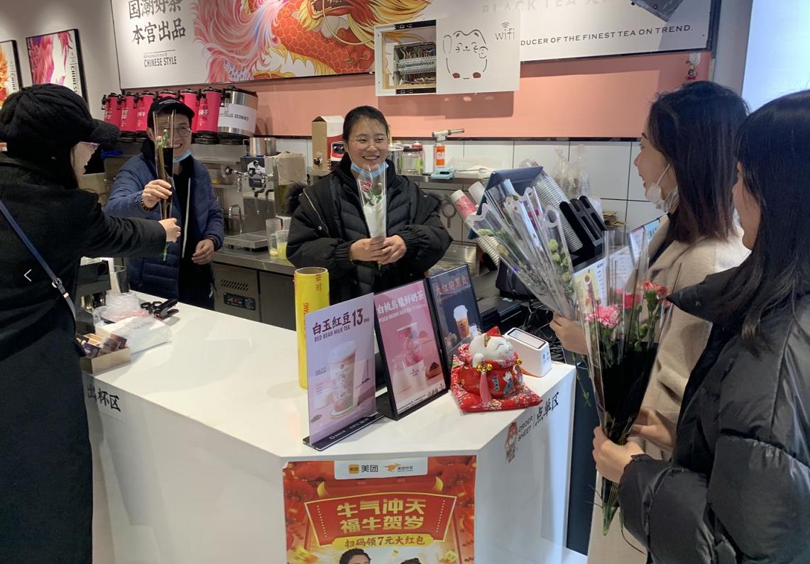 38日,名贯彩票博士研究生党支部和硕士研究生党支部到莱山区祥隆社区开展“三八妇女节送鲜花”活动,为社区居民和商铺女同胞送去了节日的祝福。