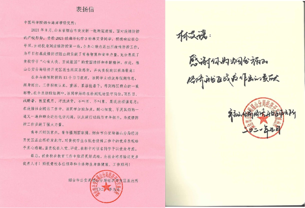 近日,研究所收到烟台市公安局福山分局经济开发区派出所发来的感谢信,对2021级硕士研究生林艾诺同学在参加疫情防控志愿服务过程中对烟台疫情防控工作所作贡献表示感谢。
