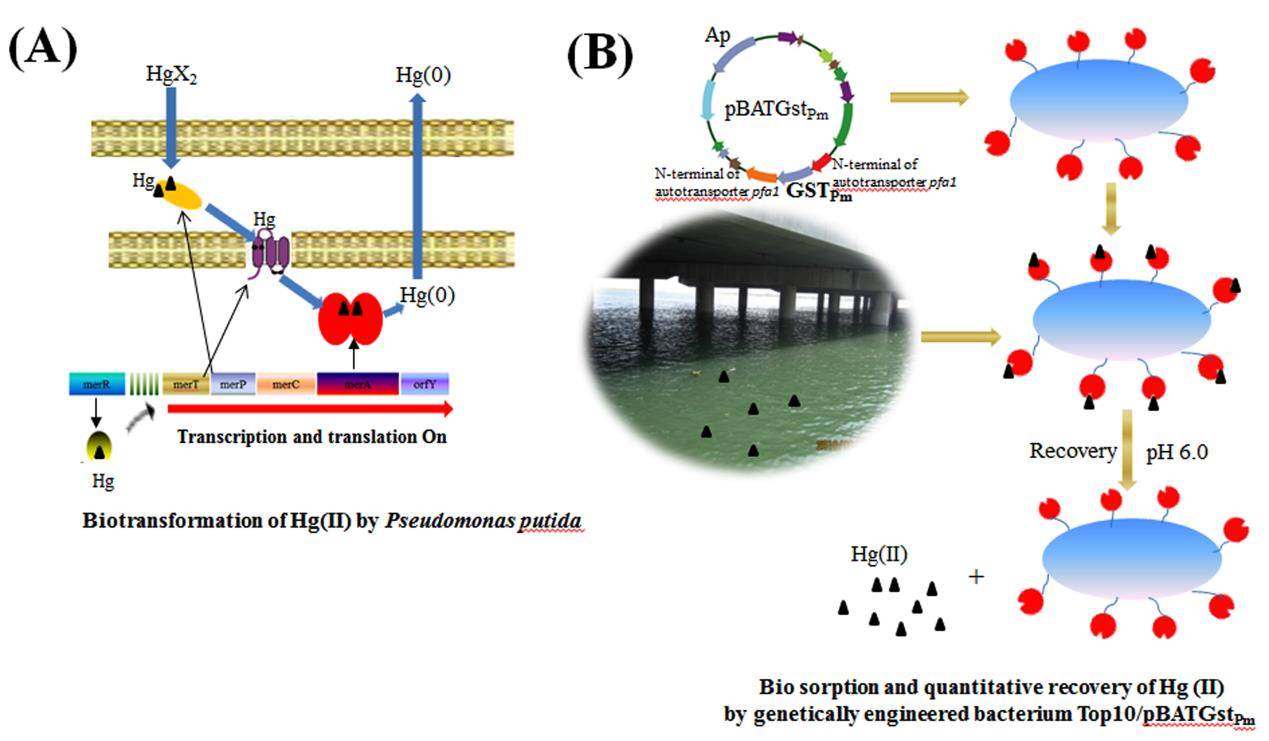 近期,名贯彩票陈令新研究员领导的“环境微分析与监测” 研究组提出了2种清除海水基质中Hg(II)污染的策略,有助于海洋环境中汞污染清除技术的未来发展。一种策略(图A)是通过抗汞恶臭假单胞菌体内的mer操纵子,将环境中的Hg(II)转化为Hg(0),该菌能全部还原海水基质中280 μM的Hg(II)。由于Hg(0)的毒性较小并且可以通过多孔材料进行定量回收,因此通过恶臭假单胞菌的转化过程可以清除环境中的Hg(II)污染。另一种策略(图B)是通过构建表面展示的基因工程菌Top10/pBATGst,对环境中的Hg(II)进行吸附。利用含有自转运蛋白的分泌序列的载体pBAT作为一种表面展示工具,将来自于奇异变形杆菌的谷胱甘肽转移酶(GST)连接到其后面,构建一种能够将内源性的GST表达在细菌表面的载体和工程菌。在该基因工程菌中,GST基因和分泌序列结合形成in-frame融合,以融合基因的方式表达,同时融合的异源肽为GST所容忍,不影响其关键结构域的形成以及功能活性,因此GST可以融合蛋白的形式被运输至胞外并具有吸附Hg(II)的功能。