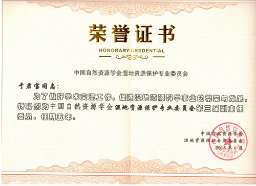 于君宝研究员被聘为中国自然资源学会湿地资源保护专业委员会第三届副主任委员