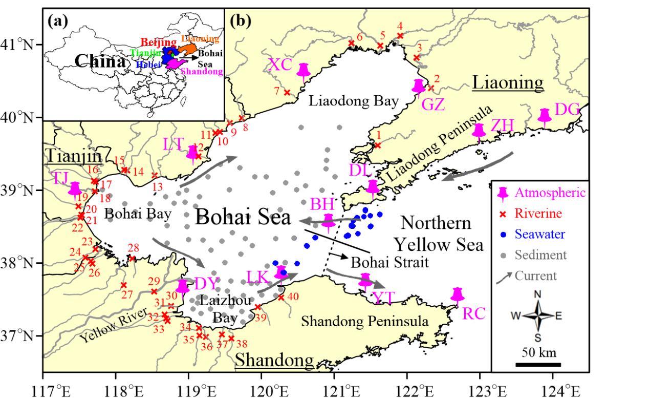 在中国科学院战略先导专项、国家自然科学基金和中国科学院海岸带环境过程与生态修复重点实验室开放基金的支持下,自2013年烟台海岸带研究所海岸环境地球化学过程与模拟课题组在渤海区域构建了一个基于12个大气沉降站和40条河流定点的陆源污染物入海监测体系,同时结合研究所自主航次加强了渤海海水和沉积物的监测。