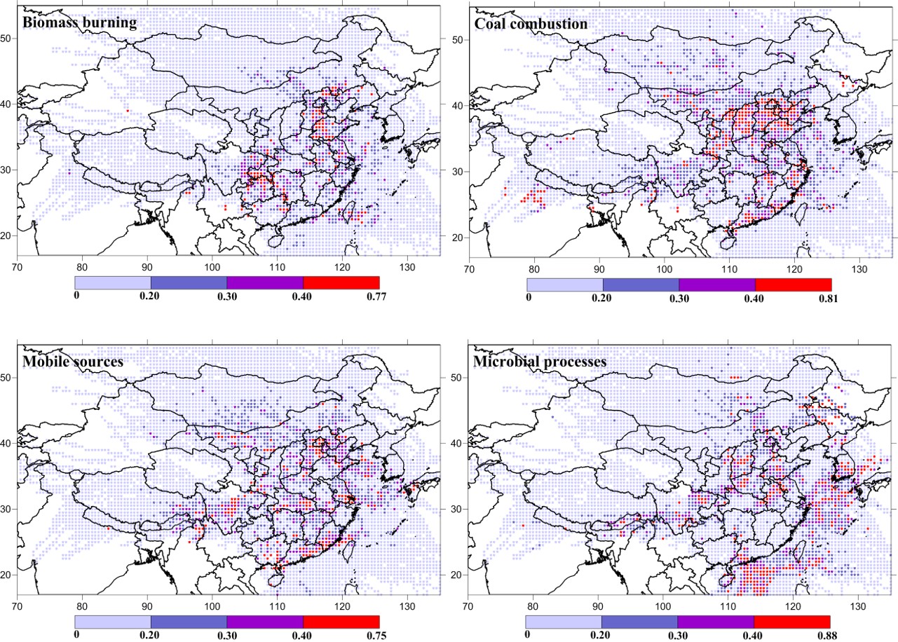 (4)利用大气NOx来源解析方法与PSCF模型联合拓展应用,对我国五个主要城市(北京、上海、广州、武汉、成都)NOx来源特征及源区分布进行了解析,结果再次表明燃煤源亦是我国城市区域NOx的主要来源,贡献比例在31.1%-41.0%,主要来源于我国华北地区(供暖、电厂贡献)和南部较为发达的地区(电厂贡献)。相关研究结果发表于环境科学与工程领域期刊Environment International(IF=7.577)。