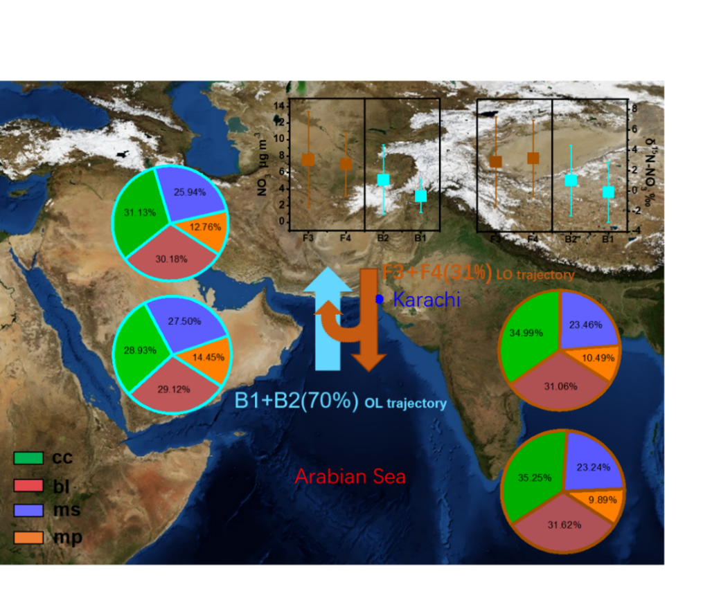 (5)为了验证该方法的普适性,与巴基斯坦COMSATS信息技术学院合作,将该大气NOx的来源解析方法应用到热带地区,结合排放源海陆性质,解析了阿拉伯海地区海洋源对巴基斯坦重要城市卡拉奇NOx的贡献特征,贡献约为16.8%,其中闪电源、船舶源与微生物源分别贡献了20.3%,46.3%和33.4%。相关研究结果发表于环境科学与工程领域期刊Environmental Science & Technology(IF=7.864)。