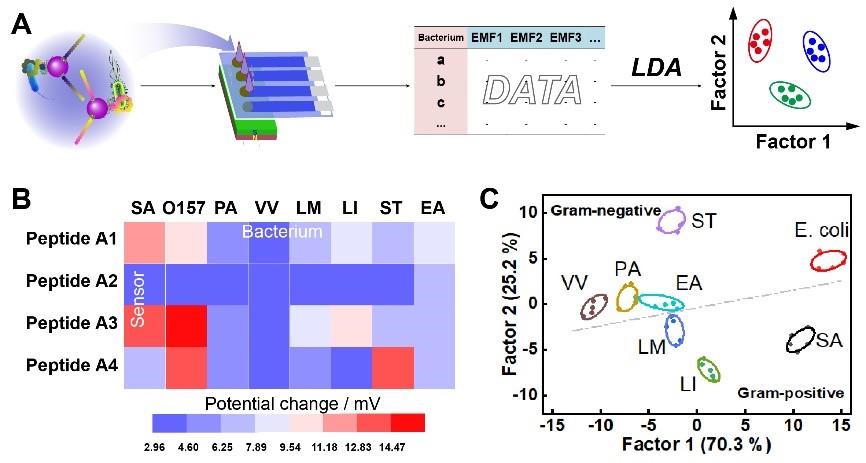 图1. 磁控电位型生物传感器阵列及其在多种细菌分类鉴别中的应用
