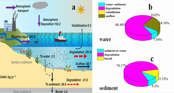 图1. BDE 209在渤海的源汇收支模拟(a.总通量 b. 海水中的汇 c.沉积物中的汇)