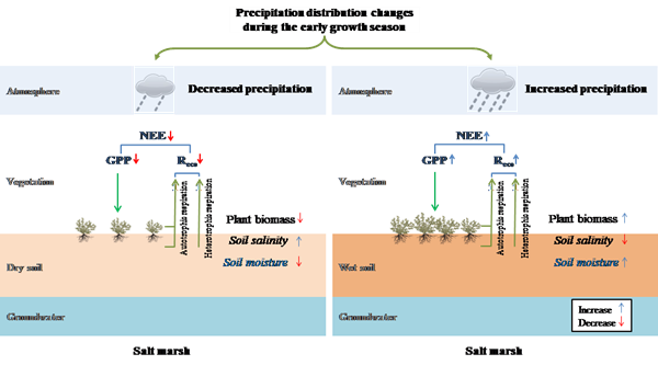 图1 植被生长早期降雨变化对滨海湿地碳交换的影响机制