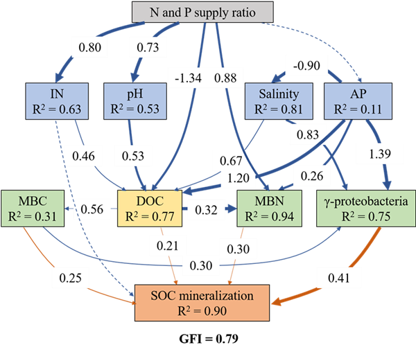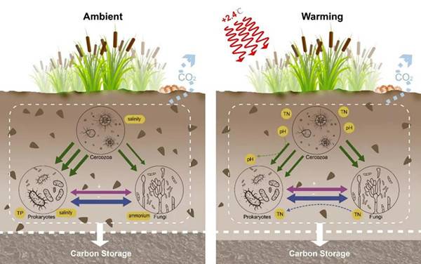 基于增温野外控制试验平台(增温2.4℃),发现6年的持续增温不仅改变了滨海湿地微生物群落的多样性,同时也改变了微生物之间的相互作用关系。真菌对增温表现出较强的耐受能力,这种耐受能力同时稳定了真菌与其他两类微生物之间的联系。另外,跨域网络模块与土壤有机质的负相关关系在增温条件下强化,这可能对土壤碳储存功能造成威胁(Zhou et al. 2021, Global Change Biology)。另外,野外长期氮磷添加控制试验平台5年的监测数据表明,氮磷输入通过提高土壤养分有效性刺激植物生长并改变土壤微生物群落结构,进一步导致土壤中活性有机碳组分(可溶性有机碳(DOC)和微生物生物量碳(MBC))增加,而芳香DOC含量减少,这些变化共同作用影响土壤有机碳矿化作用。其中,当氮磷输入比例为15:1时,土壤有机碳矿化作用最为强烈(Li et al. 2022, Catena)。