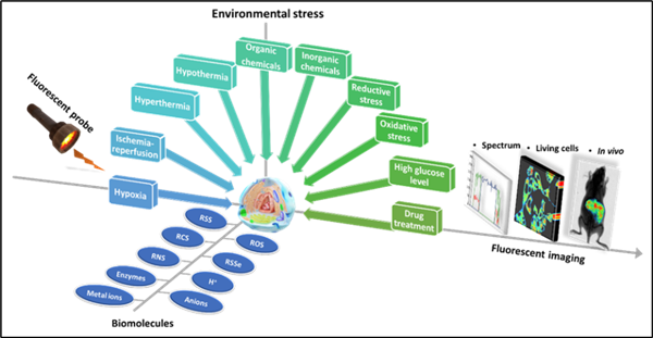 近年来,荧光探针在可视化实时动态检测各种生物分子的浓度变化和迁移方面取得了蓬勃发展。环境因素影响着生物活性分子在有机体的各生命过程中的分布和浓度变化。如图1所示,本文介绍了荧光探针的设计策略以及其应用于不同环境刺激下(例如:缺氧胁迫、缺血再灌注过程、高温/低温刺激、有机/无机化学品暴露、氧化/还原压力胁迫、高血糖刺激和药物治疗引起的毒性等)的活性分子(主要包括:活性氧物种、活性氮物种、活性硫物种、活性硒物种、金属离子以及酶等)的体内外检测。生物体生存受各种环境因素,包括非生物因素(例如:温度、盐度、光照、pH以及氧气浓度)和生物因素(例如:细菌、病毒感染等)的影响。外界环境因素改变造成的胁迫,会传递给有机体,细胞膜上受体接收到刺激信号,从而触发第二信使的产生和传递,其中包括具有不同生理特性的各种生物活性分子(例如:气体、自由基、离子、核苷酸、脂质和脂质衍生物等)。监测环境胁迫下细胞应激反应过程中生物(活性)分子水平的变化对于分子机制的研究、分子靶向治疗的发展和药物的发现提供巨大的潜力,并最终有利于揭示环境、健康和疾病之间的关系。