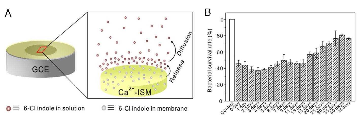 微生物污染物具有生长和繁殖能力,即使有少量的微生物附着在传感器表面,它们也能够通过不断地生长和繁殖,形成遍布整个传感器表面的生物膜,造成严重的传感器污损。为解决这一问题,课题组发展了具有释放杀菌功能的聚合物敏感膜电位型传感器。以环境友好且具有杀菌性能的有机小分子6-氯吲哚作为防污活性材料,采用掺杂法将防污材料引入聚合物敏感膜中,构建了具有自灭菌功能的传感器(图2A)。研究结果显示,6-氯吲哚能够有效杀灭附着于传感器表面的微生物,达到缓解微生物污损的效果;聚合物敏感膜中的6-氯吲哚释放缓慢,传感器对微生物的灭杀性能可保持45天(图2B)。该防污损方法在传感器原位、长期监测中具有广阔的应用前景(Anal. Chem., 2020, 92(18), 12132-12136)。