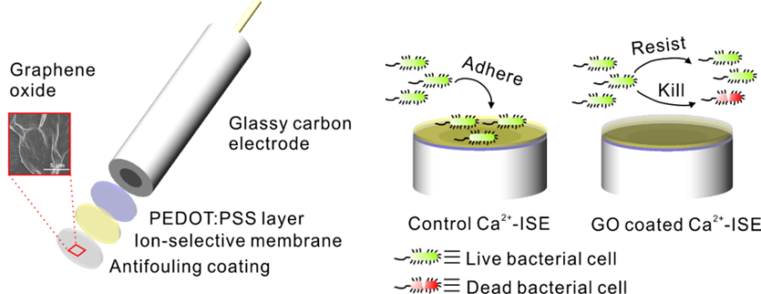 图3. 基于氧化石墨烯的聚合物敏感膜电位型传感器的构建和防污原理示意图