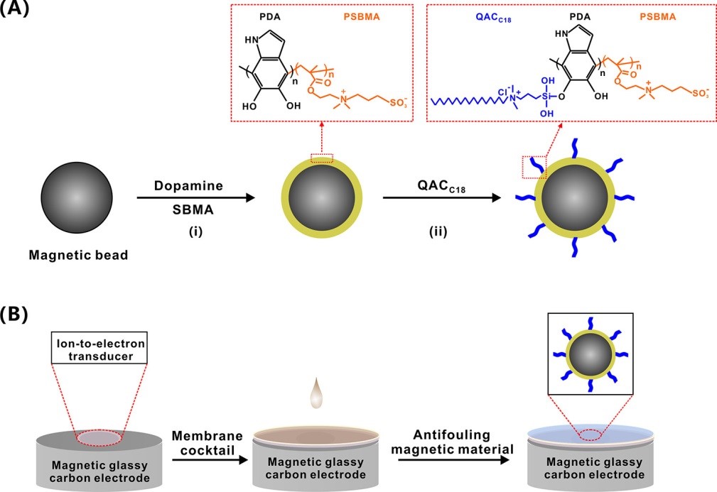 图4. 磁性双功能纳米材料的合成(A)及可更新式防污损传感器的构建(B)示意图