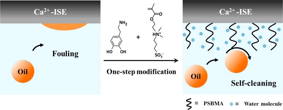 图1. 基于两性离子聚合物修饰的自清洁防油污聚合物敏感膜电位型传感器