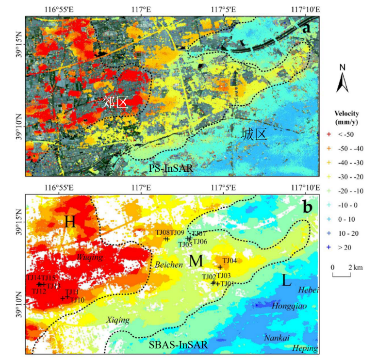 图1 天津市城区与西郊区地面沉降遥感反演结果(A)PS-InSAR (B)SBAS-InSAR