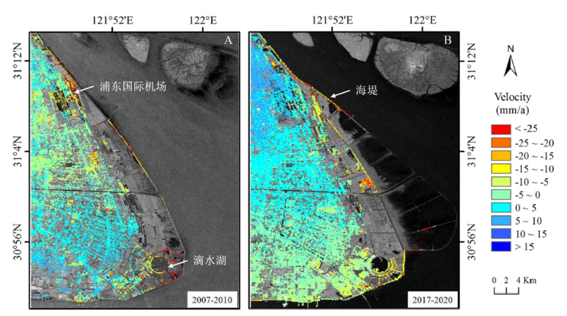 研究发现,天津地区的地面沉降遥感反演结果(2017-2019)显示,天津市区地表沉降速率已控制在较低水平,但天津市西郊地面沉降现象仍较为严重,很多城镇区域沉降速率已超过50 mm/year。上海促淤造地新成陆区的地面沉降遥感监测结果(2007-2010,2017-2020)显示,新成陆地区域存在不均匀沉降现象,随着时间的推移沉降速率逐渐变缓;近海地区的沉降比内陆地区更为显著,沉降严重区域(>25 mm/year)主要集中在滴水湖周边及海堤区域。