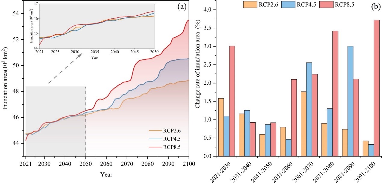 图1 三种情景下至2100年中国海岸带可能最大淹没面积(a)及其变化率(b)