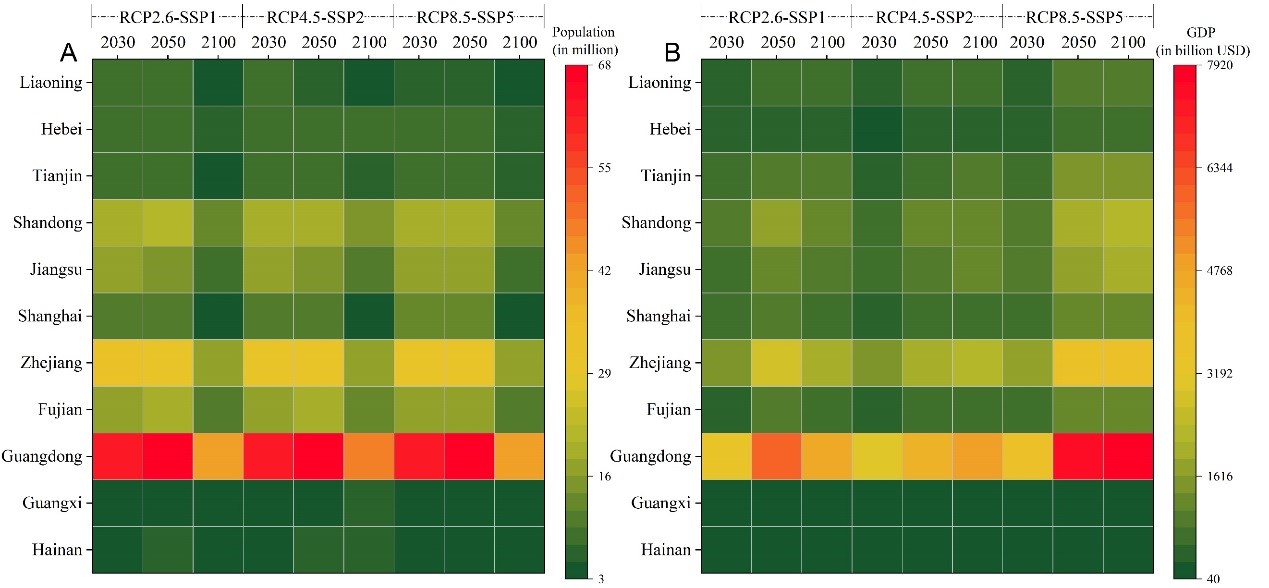 图3 RCP2.6-SSP1、RCP4.5-SSP2、RCP8.5-SSP5情景下2030、2050、2100年不同省份典型风险区预计影响的人口(A)和GDP数量(B)
