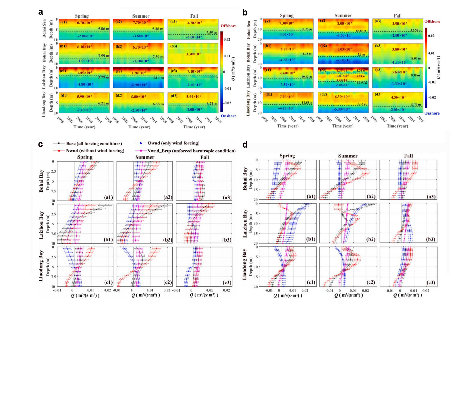 图1:1998年至2019年,渤海及渤海三个海湾内跨(a)10米等深线及(b)20米等深线的水平平均通量的季节变化。2019年渤海三个海湾内跨(c)10米等深线及(d)20米等深线的水平平均通量和标准误差(水平误差条)在不同风场和斜压梯度条件下的季节变化。