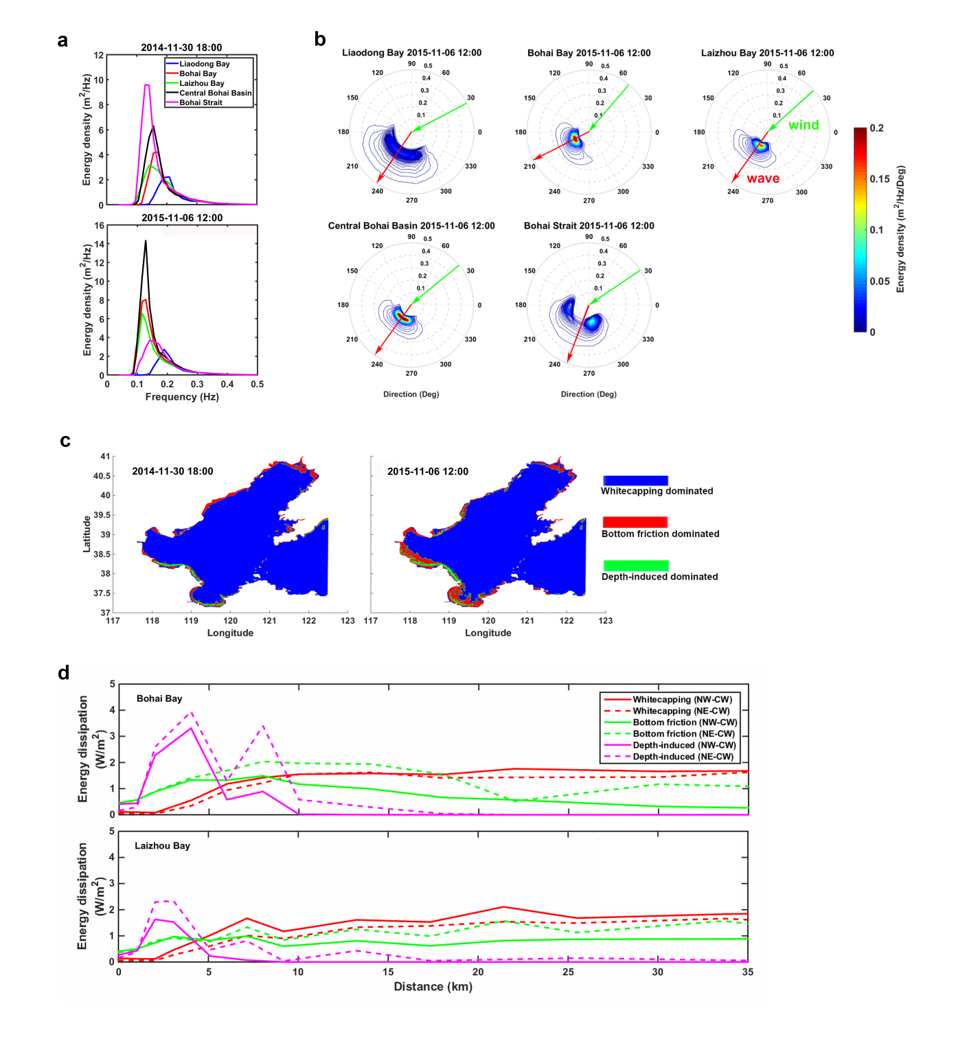 图2 渤海寒潮过程中有效波高峰值时刻(a)各海区一维波谱;(b)二维波谱及风向波向;(c)白浪耗散、底摩擦耗散及深度诱导耗散占主导的空间量化;(d)渤海湾及莱州湾近岸白浪耗散、底摩擦耗散及深度诱导耗散的空间变化。