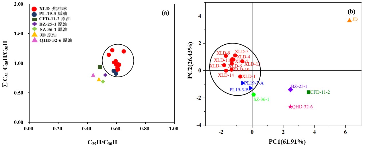 图2 (a) C29 H/C30 H与∑C31-C35 H/C30 H的双比图; (b) 焦油球与参考原油样品的PCA分析