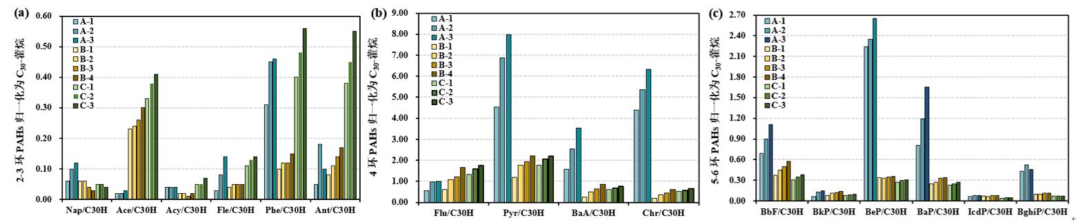 图3 焦油球样品不同层的 (a) 2-3环、(b) 4环和 (c) 5-6环多环芳烃归一化为C30 αβ-藿烷比值