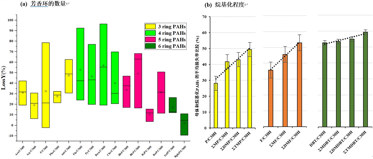 图4(a)焦油球表层中每种母体PAHs化合物的损失率;(b)表层中母体和烷基化PAHs的平均损失率