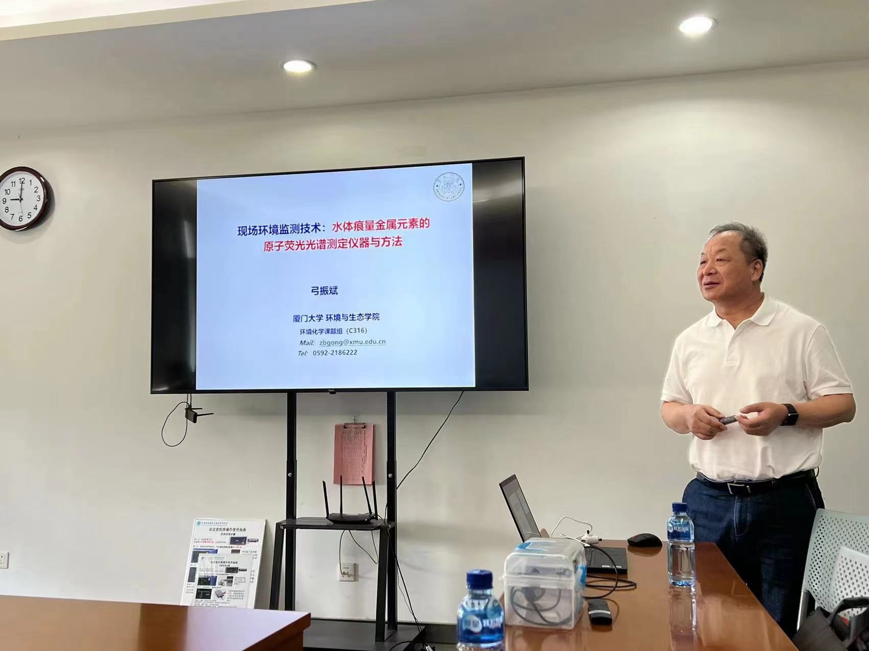 弓振斌教授主要从事海洋分析化学、环境地球化学研究,在本次交流中做了题为“现场环境监测技术:水体痕量金属元素的原子荧光光谱测定仪器与方法”的研究报告,该报告主要介绍了水体中(尤其是高盐基底水体即海水)痕量金属现场监测的研究背景与现状、原子荧光光谱现场检测仪器的检测原理与方法、便携式船载原子荧光光谱仪现场应用(船载测定及现场示范)及多元素同时测定技术等。参会人员针对海洋现场检测技术、多元素混合标准溶液的保存等相关问题进行了热烈讨论和深入交流。