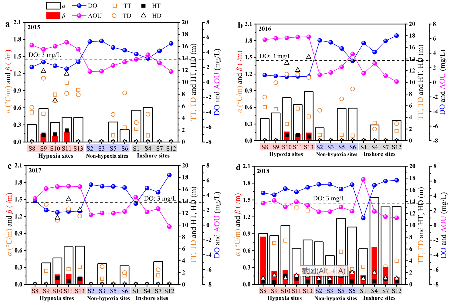 图1 养马岛附近海域水体层化和底层耗氧对海水DO的影响(α:温跃层强度;β:盐跃层强度;TT:温跃层厚度;TD:温跃层上边界深度;HT:盐跃层厚度;HD:盐跃层上边界深度;AOU:表观耗氧量)(Sun et al., ER 2023, 228: 115810)