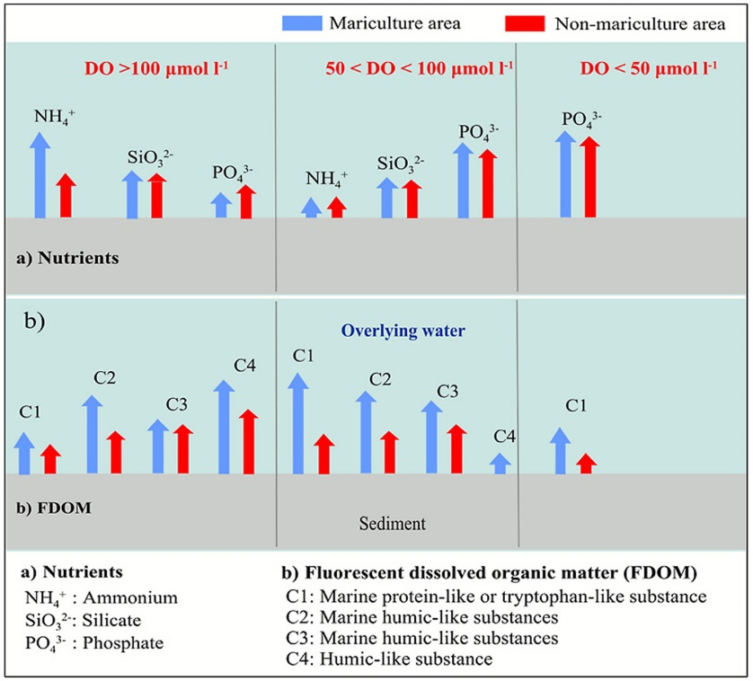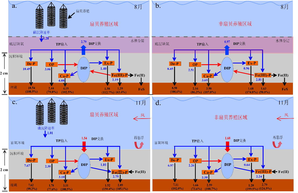 扇贝养殖活动对底层水体夏季低氧形成的促进作用还体现在其对有机质迁移转化的影响。海湾扇贝的排泄作用将大量具有高分子量和低腐殖度特征的溶解有机质(DOM)释放到水柱中,改变了有机质的生物地球化学循环。海湾扇贝在一个养殖周期内(6月~11月)的排泄过程可使海水中溶解有机碳增加19.7 μmol/L,假设扇贝排泄的DOM中不稳定部分被完全耗氧分解,可使养马岛附近海域海水中DO和pH分别降低~13.4 μmol/L和~0.018(Yang et al., STOTEN 2022, 807: 150989),使水体总碱度降低75.7 μmol/kg,从而加速低氧和海水酸化的进程(Yang et al., STOTEN 2021, 798: 149214)。