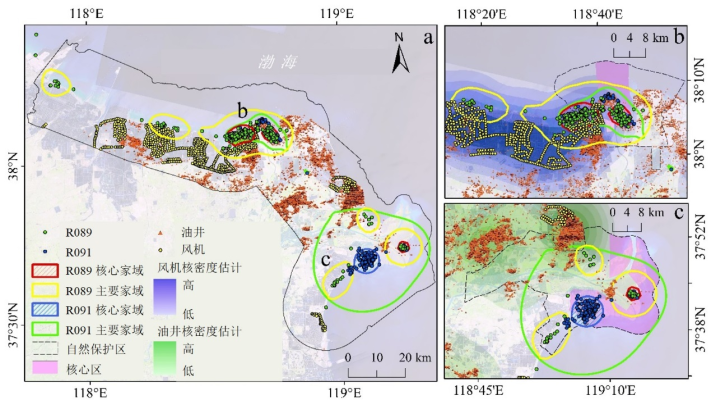 图1 黄河三角洲黑嘴鸥家域范围与典型地物(油井、风机)分布特征