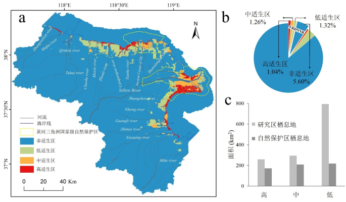 2)以国家一级保护动物黑嘴鸥为例,利用分布点和环境变量数据,结合物种分布模型,评价栖息地适宜性。如图2,结果表明:影响黑嘴鸥栖息地选择的关键环境因素包括土地利用/覆盖(LULC)类型、滩涂与碱蓬斑块的面积百分比以及到海岸线的距离;黑嘴鸥高适生区域主要集中在潮间带、盐沼湿地及河口区域;仍有近1/3的高适生区域分布在黄河三角洲国家级自然保护区之外(存在保护空缺)。