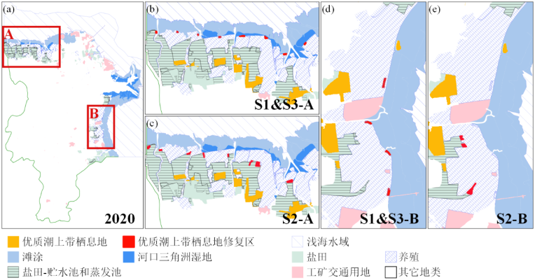 3)水鸟在潮上-潮间带之间的飞行距离是反映滨海湿地结构、格局和功能特征的重要指标,基于多源多类型遥感信息、潮汐数据、鸻鹬类水鸟同步调查数据等,结合情景分析方法,评估2000-2020年鸻鹬水鸟优质潮上带栖息地的时空变化特征,如图3,结果表明:黄河三角洲东部沿海及河口区优质潮上带栖息地面积减损最为严重,被其有效覆盖(鸻鹬水鸟可利用)的潮间栖息地显著减少;对关键位置的单块养殖池或盐田进行季节性水位管理,能够有效缓解这一问题。研究结果为滨海湿地栖息地功能优化提供了科学依据及可行方案。