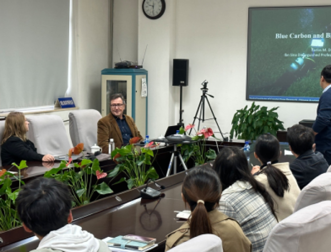 访问期间,Duarte教授在研究所做了题为“From Blue Carbon to Blue Nature Capital”的学术报告,就海岸带蓝碳生境,包括红树林、盐沼和海草床等生态系统的固碳功能和生态系统服务功能进行了详细阐述。报告同时梳理了蓝碳研究的发展历史、应用过程和气候变化、生物多样性丧失的应对意义,指出在未来研究中,除要重视碳汇效应外,还应重视生物多样性庇护、海平面上升缓冲和海岸带污染过滤等多种生态系统服务价值,形成蓝色自然资产的学术研究思路。在问答环节中,Duarte教授详细分析了中国在未来蓝碳研究中的优势和发展方向,鼓励在场师生努力引领国际蓝碳研究。