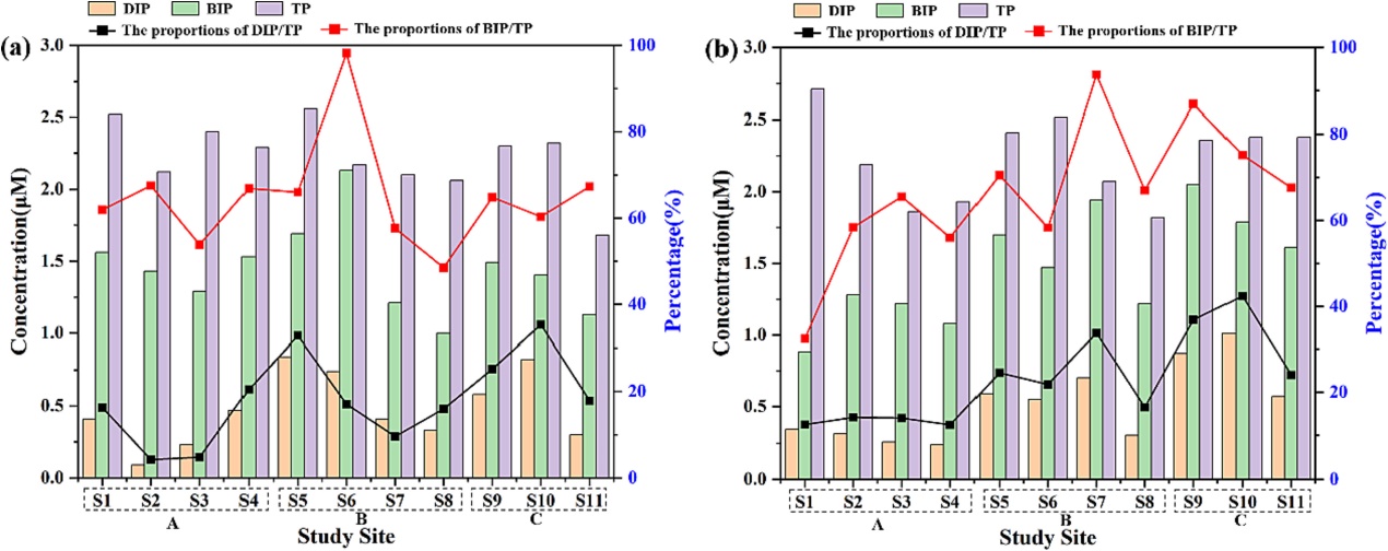 图1 烟台四十里湾表层水样(a)和底层水样(b)中DIP、BIP和TP的浓度