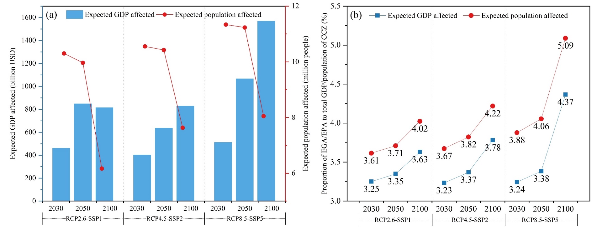 图1 三种情景下近、中、远期中国海岸带海平面上升淹没预期影响的GDP和人口的数量(a)及其占中国海岸带总GDP和人口的比重(b)