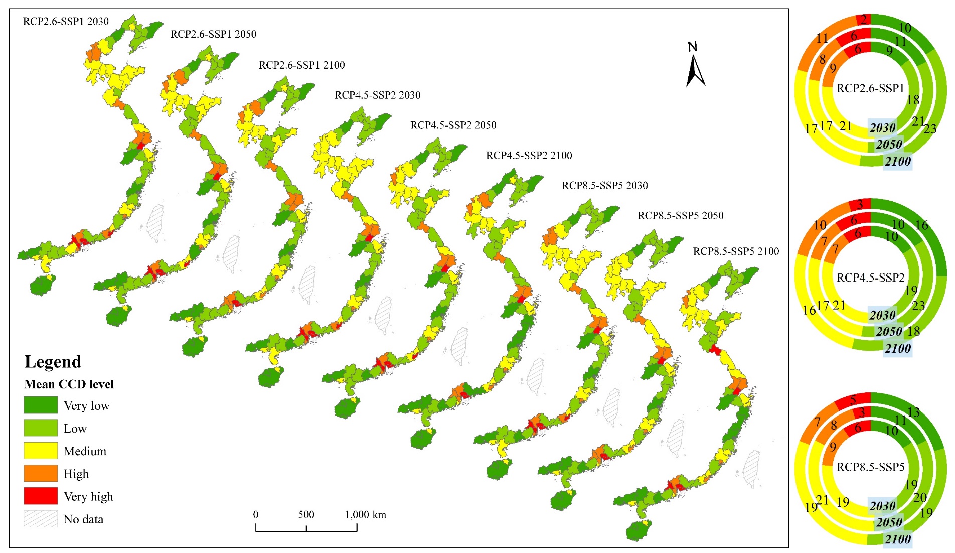 图3 三种情景下近、中、远期中国沿海城市经济社会发展与海平面上升淹没风险同步性空间分布及数量特征