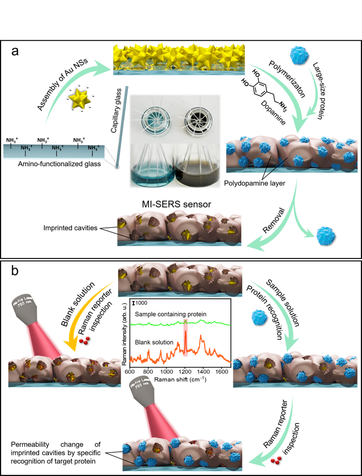 图1:(a)MI-SERS传感器构建过程的示意图及实物图(MI-SERS传感器的AuNSs固定在氨基功能化玻璃毛细管表面和多巴胺表面印迹的正视图和俯视图);(b)MI-SERS传感器上实现RRIM的原理的示意图
