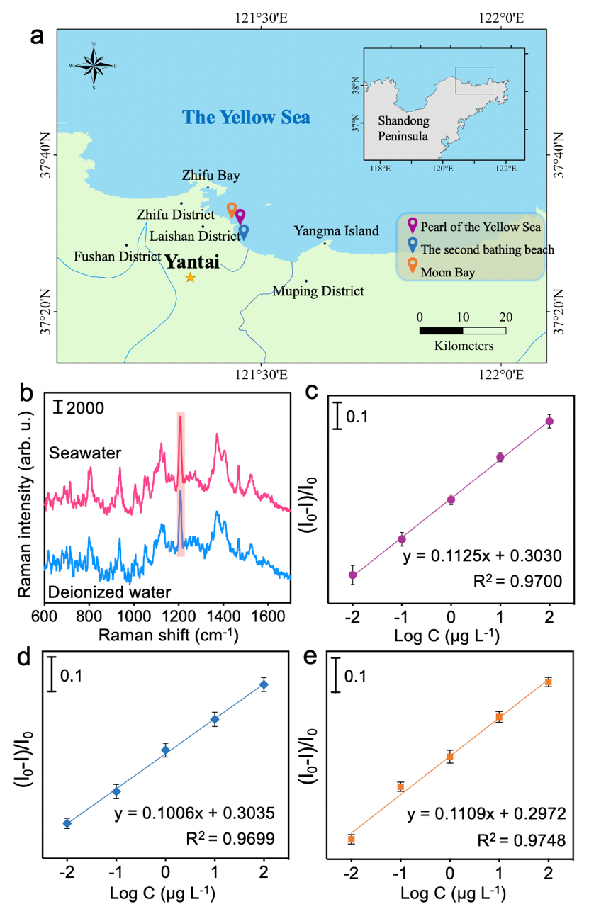 图2:(a)在北黄海(烟台市)海域对海水的采样位置图;(b)MI-SERS传感器在去离子水(纯水)和海水样中的拉曼光谱图;(b)月亮湾、(c)黄海明珠、(d)第二海水浴场的海水中加标藻蓝蛋白的浓度对数与相对SERS强度之间的线性关系图