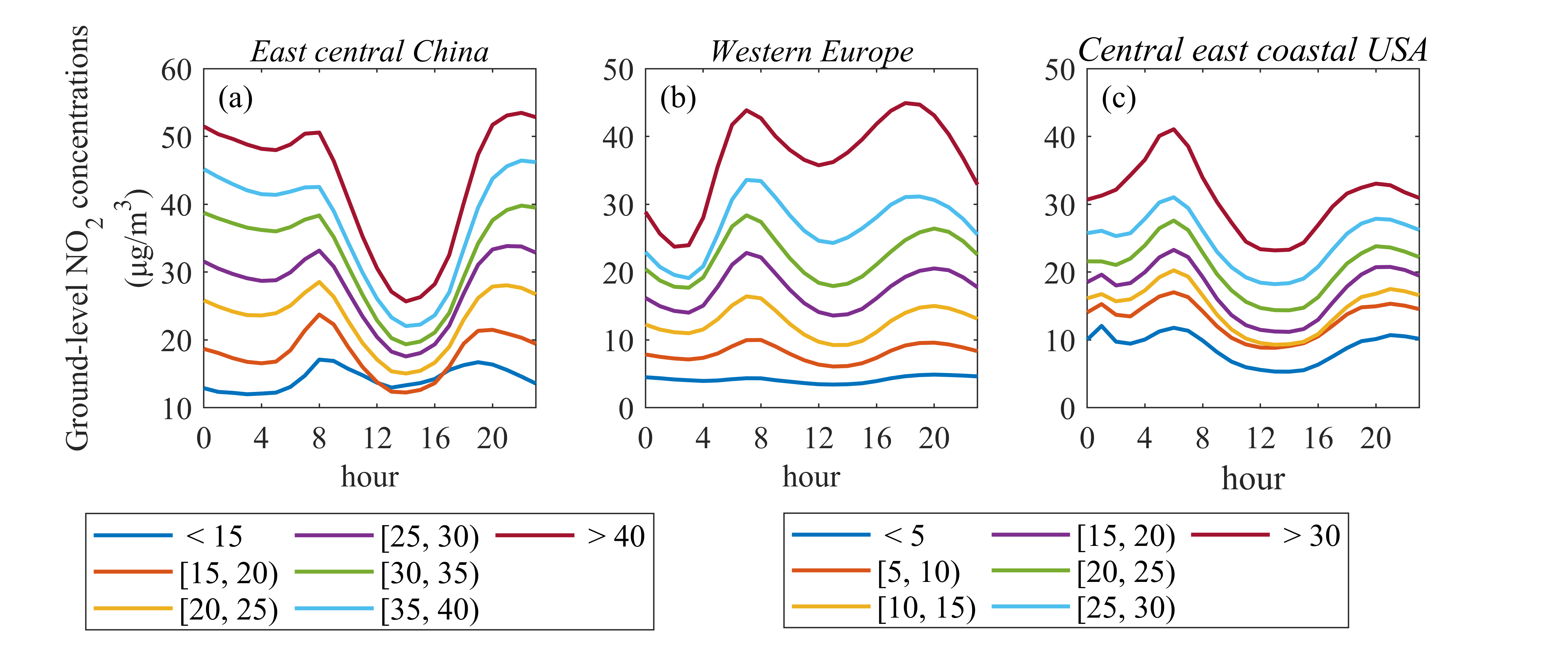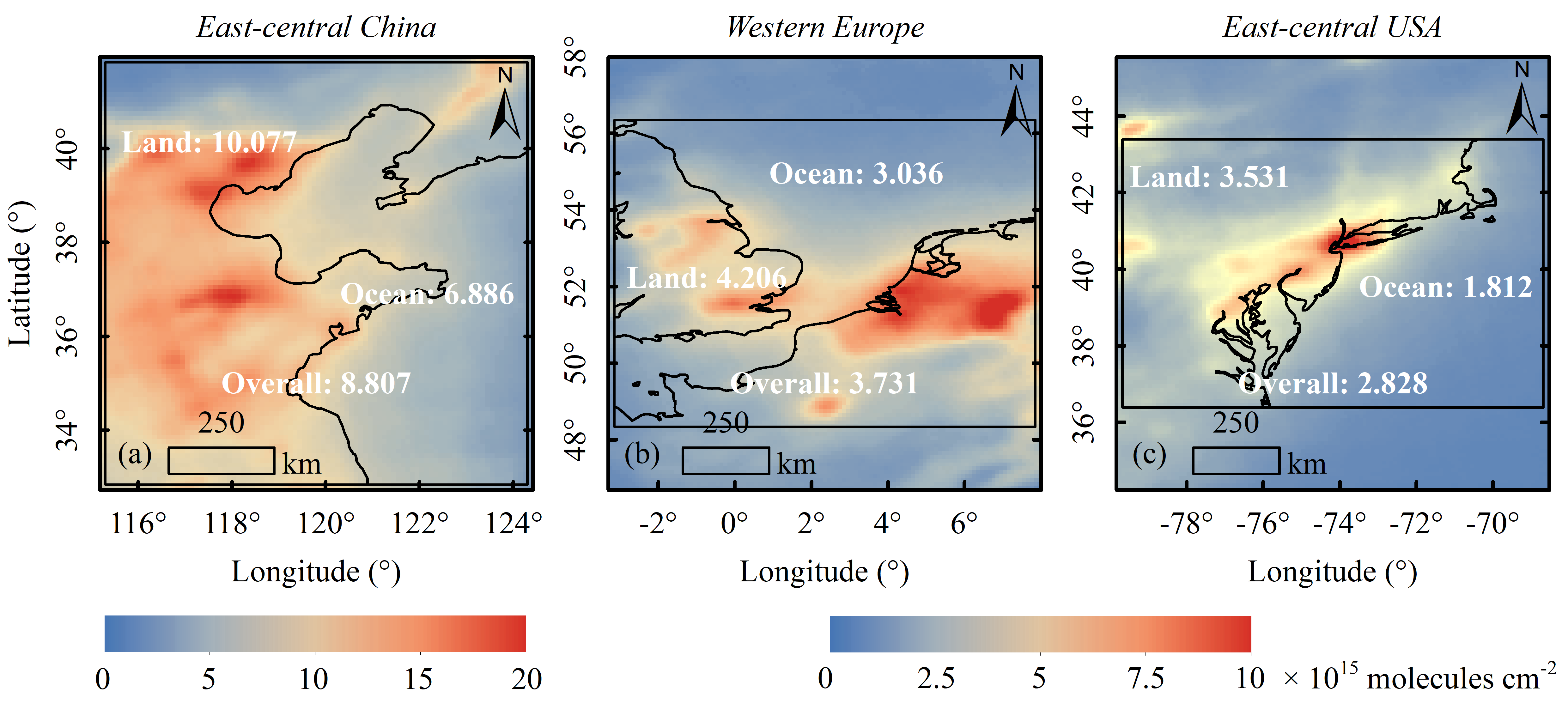 (a)中国中东部,(b)西欧,(c)美国中东部