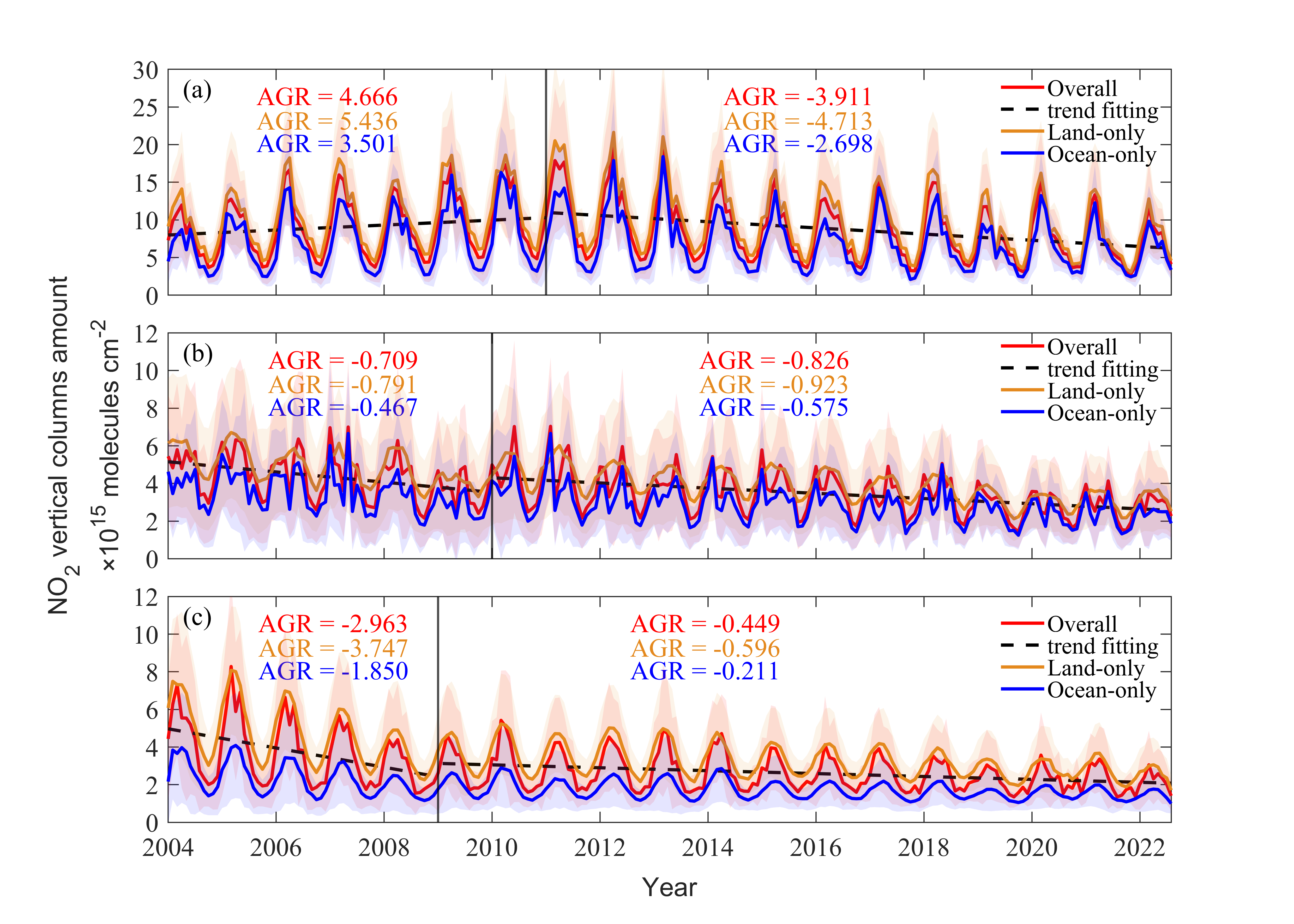 全球许多重要的经济中心和人口密集区位于海岸带,其具有特殊的地理和经济特征。同时,海岸带作为陆地与海洋相交的环境敏感区,拥有如盐沼、红树林等独特生态系统。海岸带地区的大气污染可直接影响人类健康,及通过干湿沉降作用影响生态系统物质循环。二氧化氮(NO2)作为形成臭氧等污染物的前体物,其浓度的增减对地面臭氧和PM2.5的形成有直接影响。研究海岸带地区大气NO2长期变化趋势,能够提高我们对空气污染形成机制和影响的理解,也是制定有效环境政策、保护公共健康和生态系统的基础,可为实现可持续发展和提高生活质量提供科学依据。