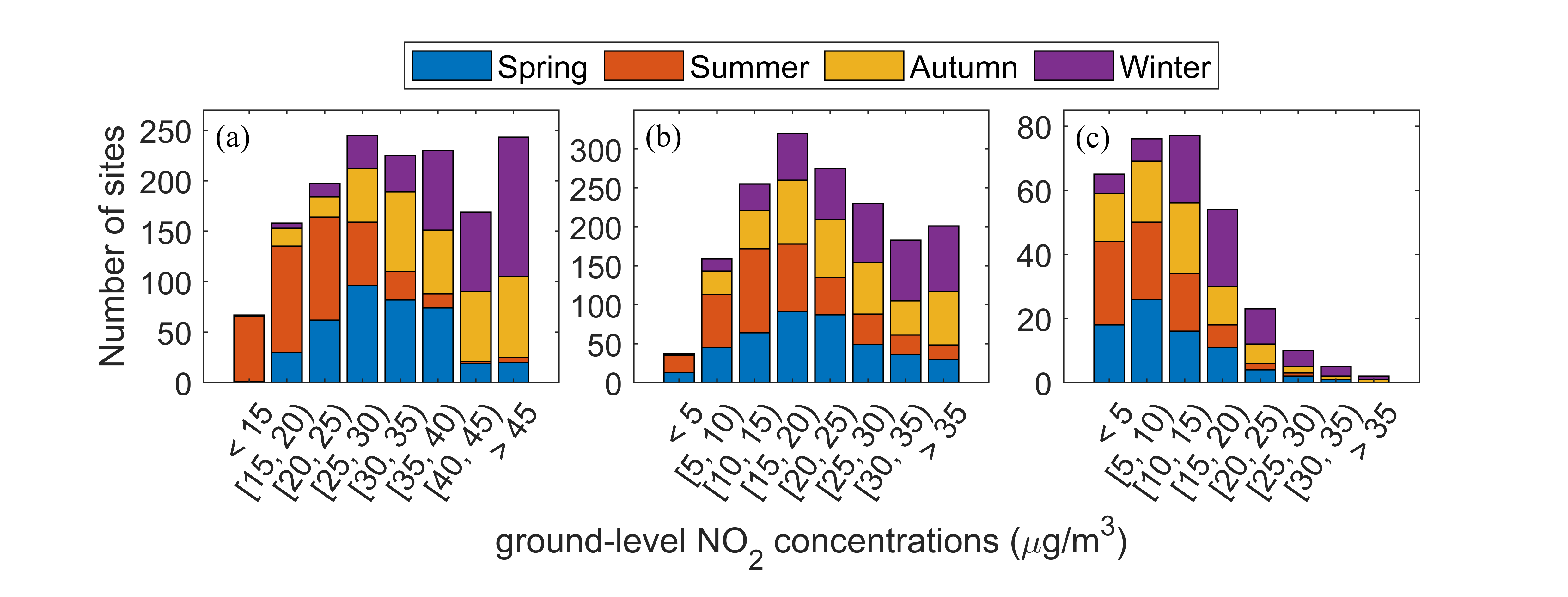 图3 不同地面NO2浓度区间站点分布统计结果