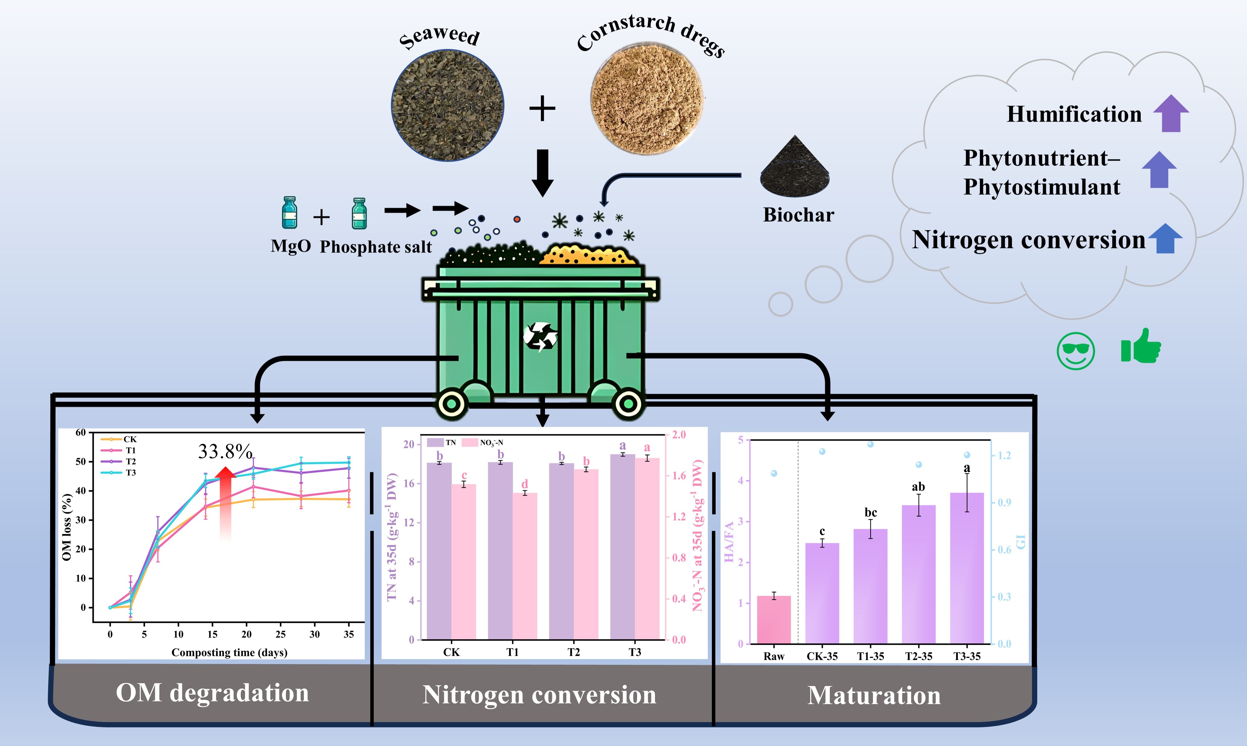 Cui,Y.,Zeng,Y.,Hu,H.,Zhang,Y.,Wang,D.,Feng,D. 2024. Biochar,phosphate,and magnesium oxide in seaweed and cornstarch dregs co-composting: Enhancing organic matter degradation,humification,and nitrogen retention. Waste Manage.,187,207-217. https://doi.org/https://doi.org/10.1016/j.wasman.2024.07.024