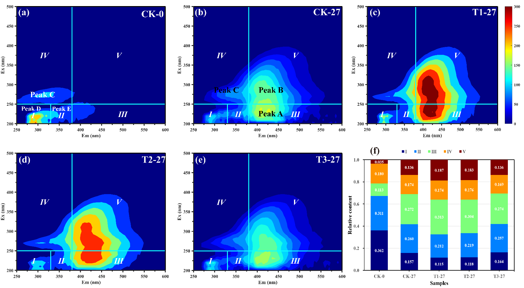 图3 三维荧光光谱 (a-e) 及区域积分体积百分比相对于原样的变化 (f)