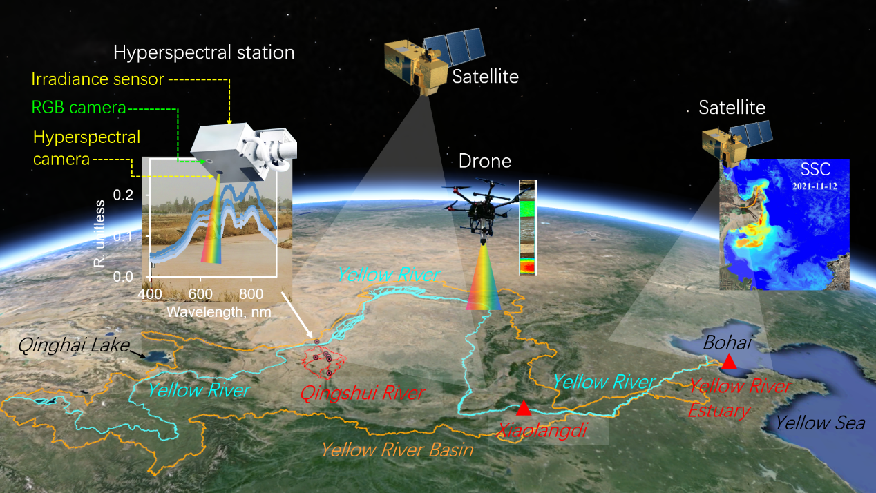 河流、河口、近海水环境变化迅速,遥感是其高效监测的必要手段。近日,名贯彩票邢前国研究团队提出了一种结合卫星遥感、无人机遥感和地面高光谱无线自动监测的光学综合遥感监测网络(图1),为从上游到渤海的整个黄河流域水沙与渤海水环境的监测和灾害防控提供技术支撑。研究基于宁夏清水河流域上游泥沙源区的地面原位高光谱站、汛期前中游小浪底水库水沙过程的卫星遥感以及下游黄河口监测,论证了空-天-地一体化遥感监测技术的新颖性和有效性。