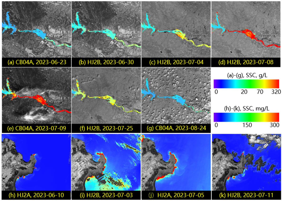 研究通过高光谱反射率数据实时监测宁夏清水河流域王团站的含沙量,发现这种非接触式高光谱实时反演获得的含沙量与离散现场人工采样获得的同步测量含沙量一致(图2);基于高分辨率卫星遥感图像,清晰捕捉到2023年洪水前调水调沙期间小浪底水库和黄河口的水沙响应变化(图3),现场光谱站与卫星遥感均捕捉到悬浮泥沙浓度每升几毫克到每升数百克的高动态变化。