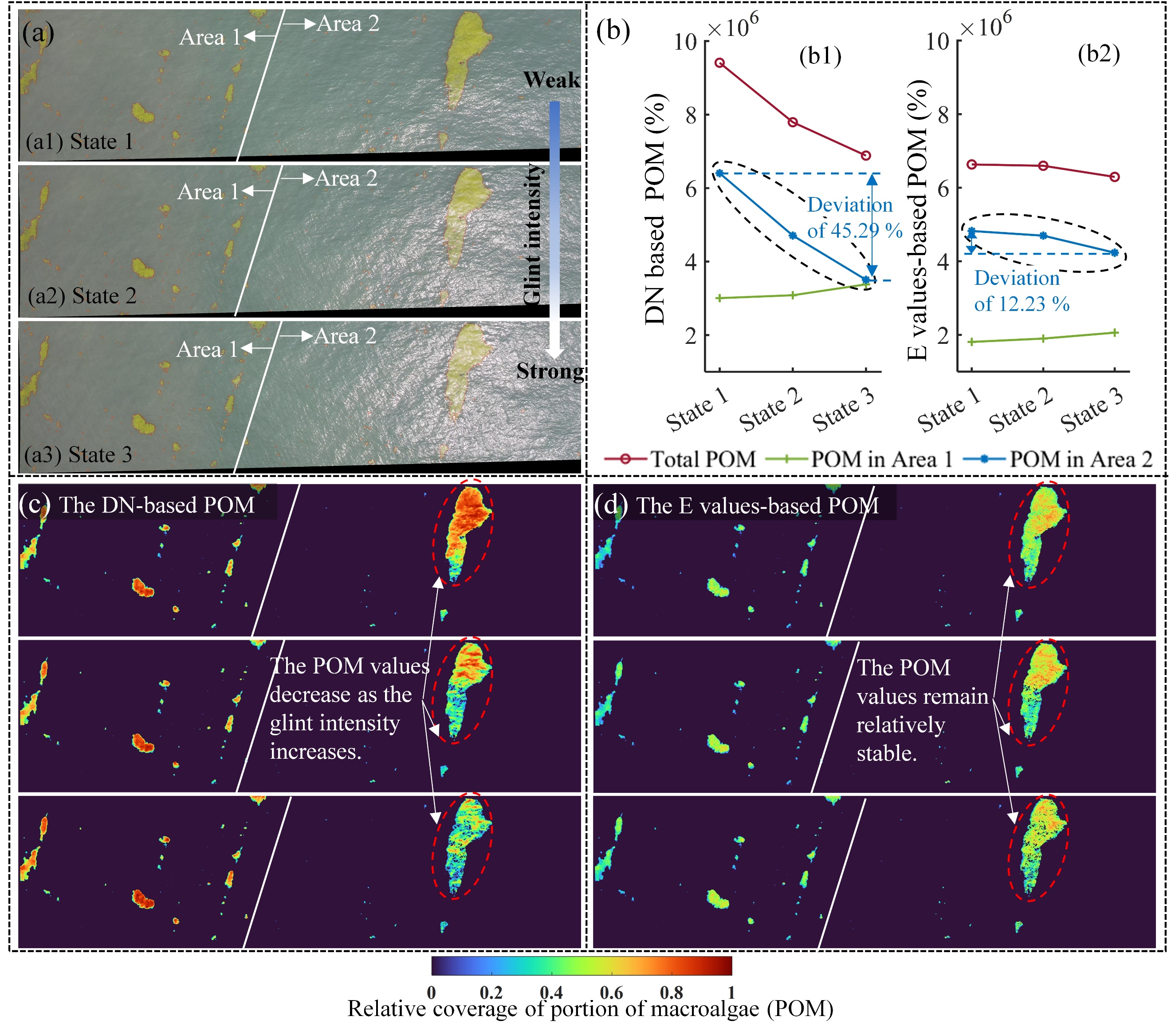 (a)无人机RGB影像;(b)状态1至状态3的POM;(c)和(d)分别为基于DN值和E值计算的漂浮浒苔(Ulva prolifera)