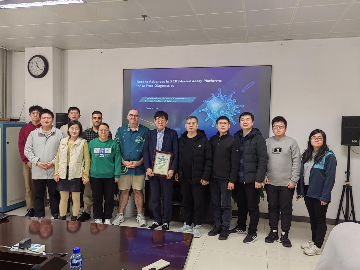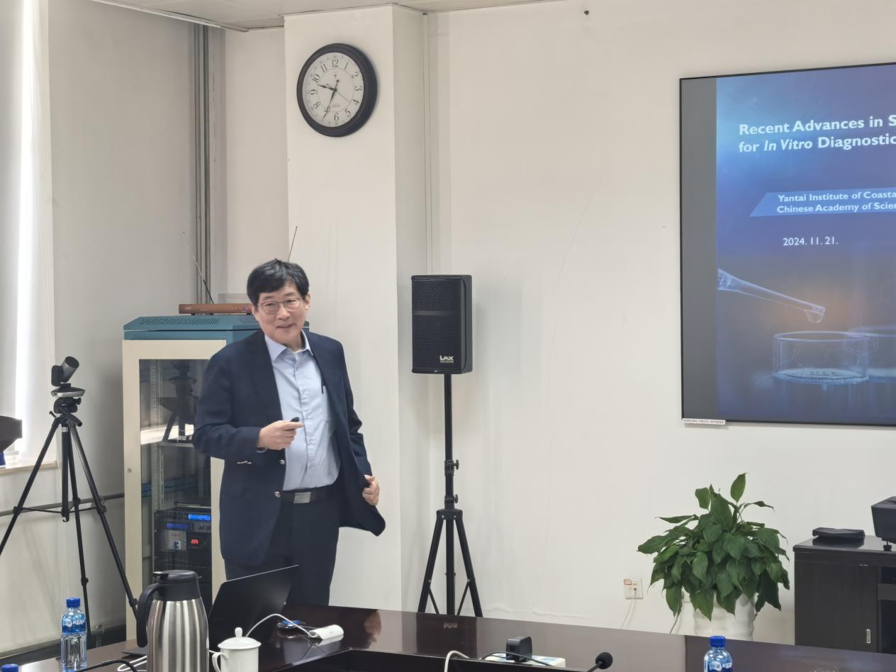 访问期间Choo教授做了题为“Nanoplasmonic Platforms for Point-of-Care Diagnosis of Infectious Diseases(用于传染病即时诊断的纳米等离子体平台)”的学术报告。报告介绍了其研究团队在基于表面增强拉曼散射(SERS)即时检验(POCT)平台的研究,阐述了在传染性疾病诊断领域取得的系列创新成果。主要包括:(1)将新型等离子材料与聚合酶链式反应技术巧妙融合,大幅缩减了新冠核酸检测时长;(2)将传统试纸条与SERS探针相结合,提升了新冠检测工作的灵敏度;(3)借助声辐射力,在微流控芯片的特定环境下,实现了对细菌的高效分离和精准检测;(4)研发了多款先进的具有广阔商业化前景的便携式器件,尤其是POCT平台展示了快速、高灵敏、样品量小、稳定性高、重复性好等优势。参会师生与Choo教授进行了热烈讨论和交流。本次学术交流拓宽了我所在SERS、微流控芯片、POCT及其在“环境-健康”关系中的应用研究等领域的视野和思路,为持续的深入合作奠定了良好基础。