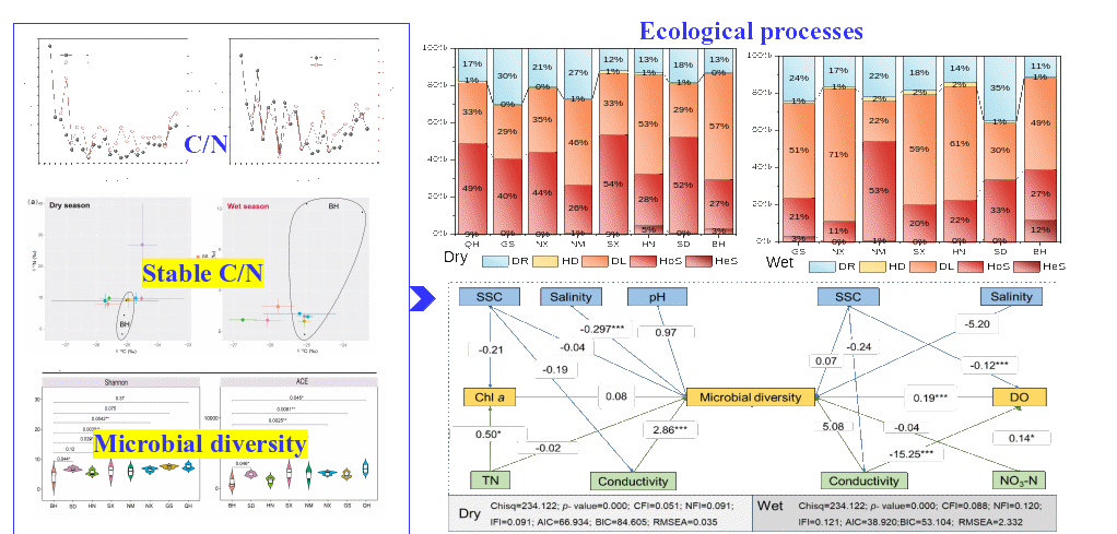 黄河泥沙在长迁移过程中营养盐比例而发生明显变化,其中碳氮比明显降低,河南至河口段微生物群落组成几乎没有显著变化,河口碳氮稳定性同位素组成与河南样品组成较为相似(图4)。研究结果确定了黄河口悬浮颗粒物的来源于以河南样品为主的下游悬浮泥沙;相关性分析发现,盐度、氮和透明度影响着水体微生物多样性组成;随机过程的分散限制在旱季和雨季的微生物群落组装过程中均具有相对较高的重要性,确定性过程表现出更高程度的同质选择。