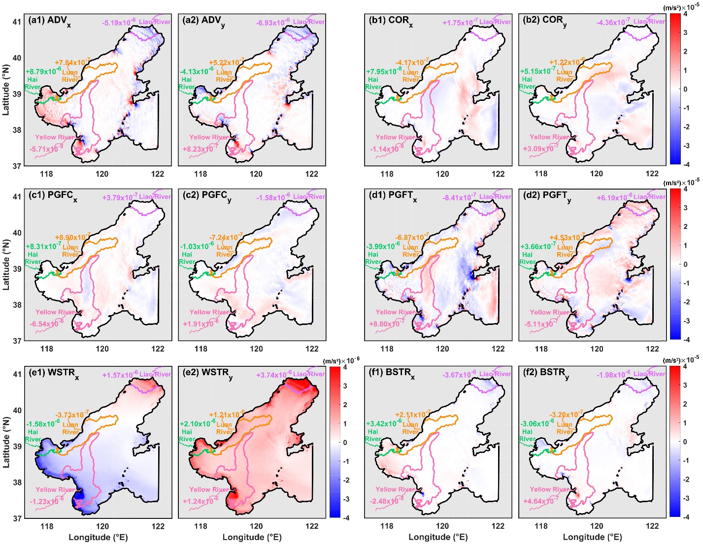 图2 2019年7月前15天内动量项的水平分布及其均值:(a1,a2) 水平平流,(b1,b2) 科里奥利力,(c1,c2) 斜压梯度力,(d1,d2) 正压梯度力,(e1,e2) 表面风应力,(f1,f2) 底摩擦应力在东西向(x)和南北向(y)方向的分布