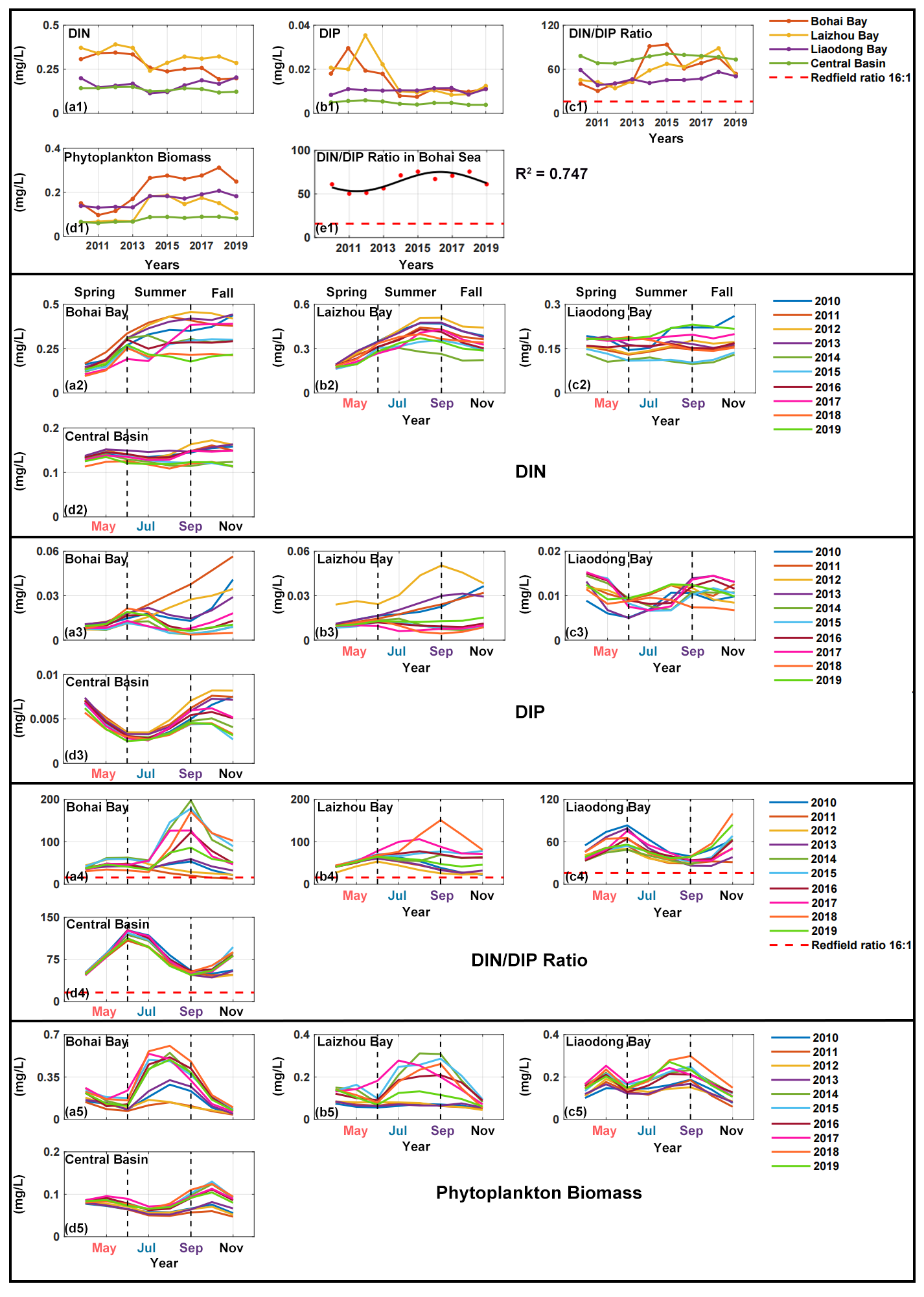 图1 2010-2019年表层DIN、DIP、DIN/DIP比值和浮游植物生物量的年际变化